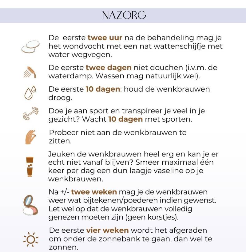 Na de behandeling kan je gewoon weer verder gaan met jouw dagelijkse bezigheden. De huid rondom de wenkbrauwen kan direct na de behandeling wat rood ogen. Dit verdwijnt binnen één tot twee uur. Ook kunnen de wenkbrauwen iets opgezwollen zijn. Hierdoor kunnen de wenkbrauwen de eerste paar dagen wat dikker ogen. Om uiteindelijk tot het mooiste resultaat te komen, is het belangrijk om onderstaande regels na te leven:
